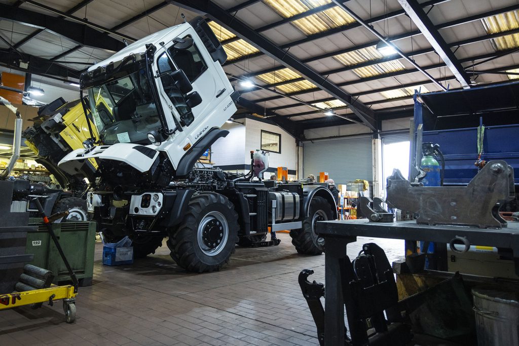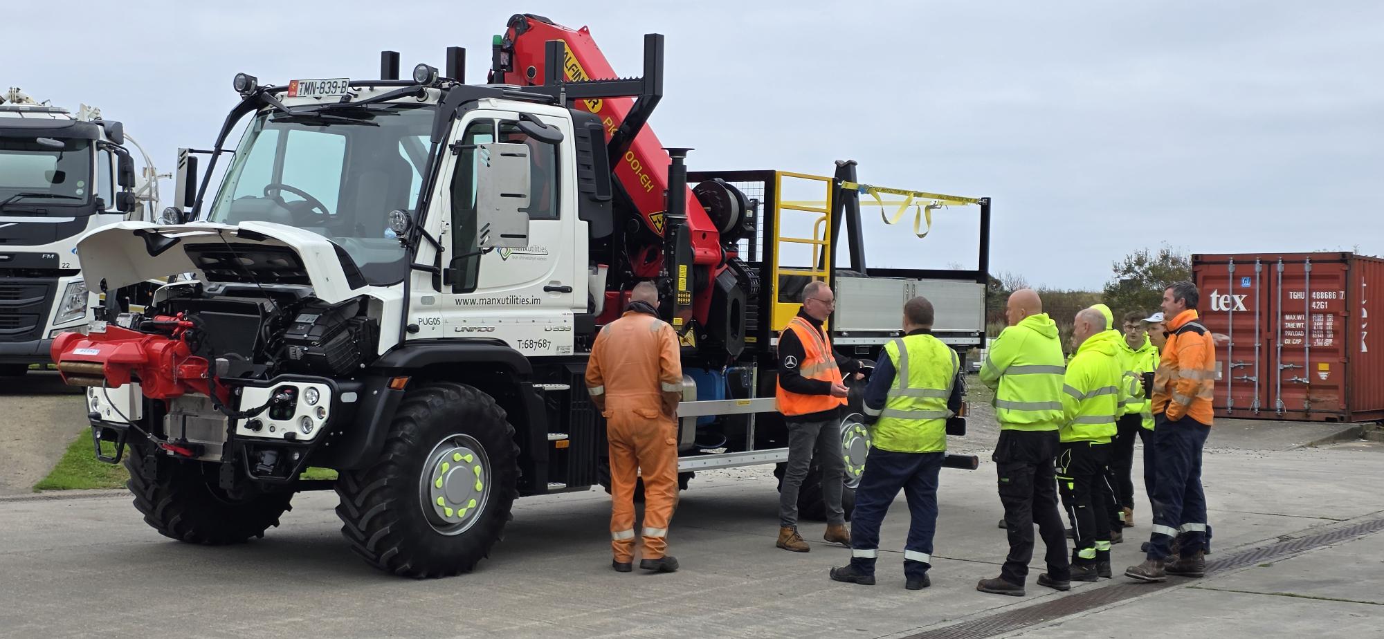 December 2025 and The Isle of Man Department of Infrastructure and Manx Utilities took delivery of the second of 2 new custom adapted Long-wheelbase Unimogs. The standard long-wheelbase U535’s received our factory approved extension to 4500mm to accommodate pole carrying bolsters, a Palfinger crane and custom body. No handover is complete, of course, without some dedicated handover training from our own MD, Tony Levitt who flew to the island to demonstrate the new vehicles extraordinary abilities to the new working team.